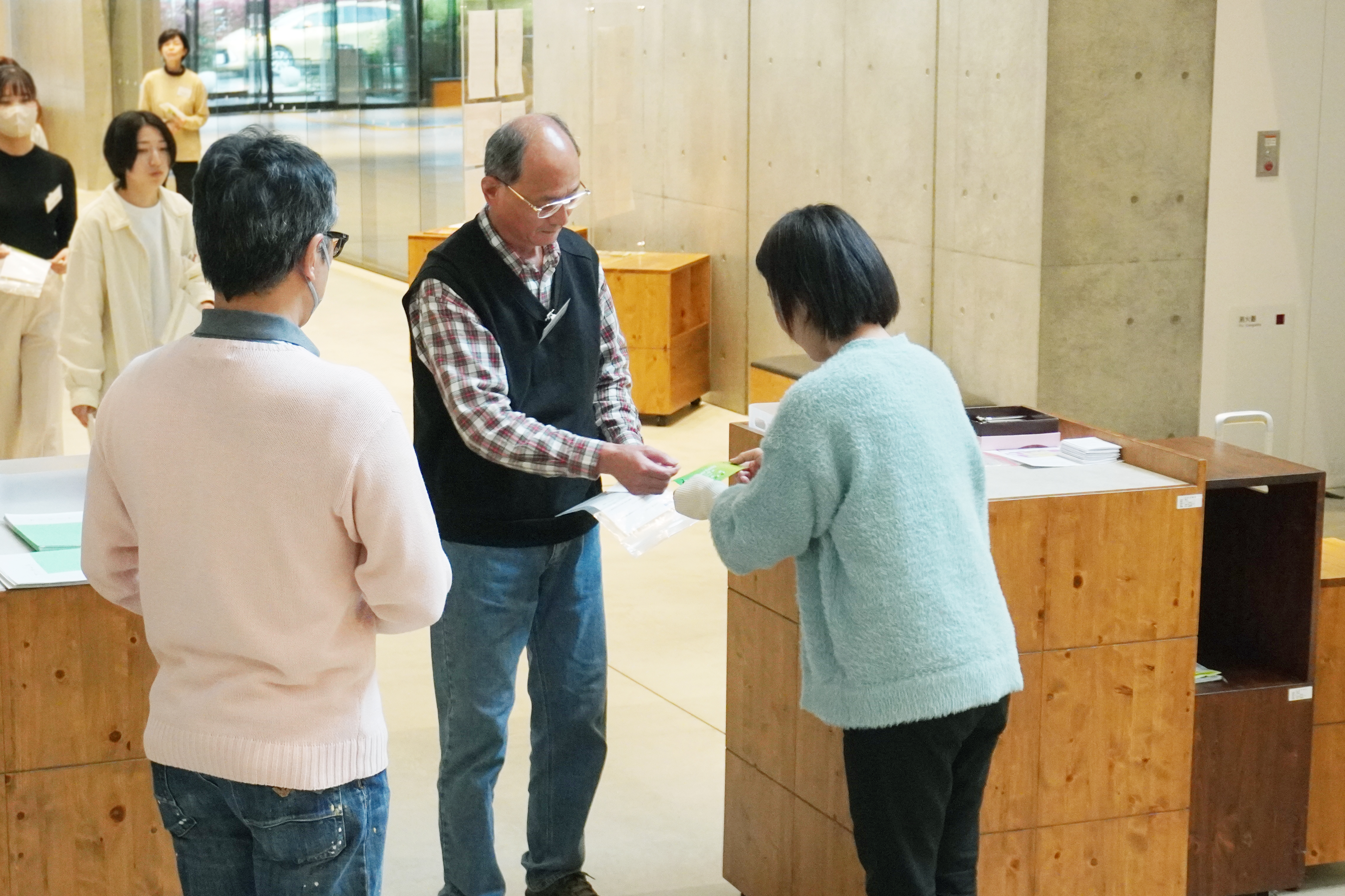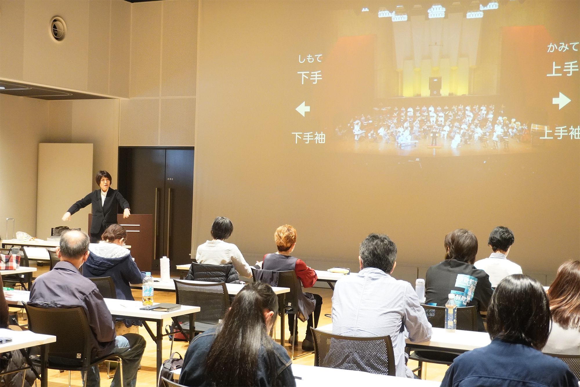 自己紹介、ホールの紹介・見学、座学(立ち方、お辞儀、声がけなど)、劇場用語・ルールの解説、エントランス業務(チケットもぎり、配布など)