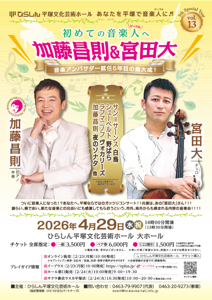 平塚出身で全国のコンサート出演や作曲、メディアでも活躍する加藤昌則さんに、年3回のコンサートシリーズで音楽アンバサダーを務めて頂きます。ホール主催事業シリーズ「あなたを平塚で音楽人に♬」の企画監修とナビゲート役として、音楽の面白さ、奥深さを伝える「大使(アンバサダー)」です。