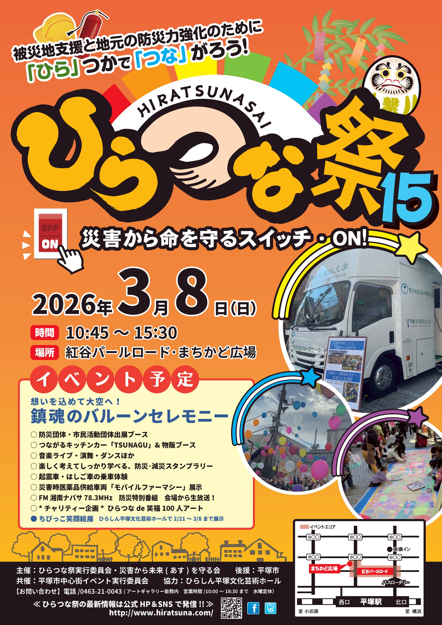「ひらつな祭」は、~災害から命を守るスイッチON!~をイベントのテーマに掲げ、楽しい催しの中に防災のエッセンスをちりばめ、それに触れてもらう事で「被災地支援と防災に取り組む事の大切さ」を少しでも身近に感じてもらいたい...そんな想いで東日本大震災の翌年から毎年3月に開催している防災イベントです。