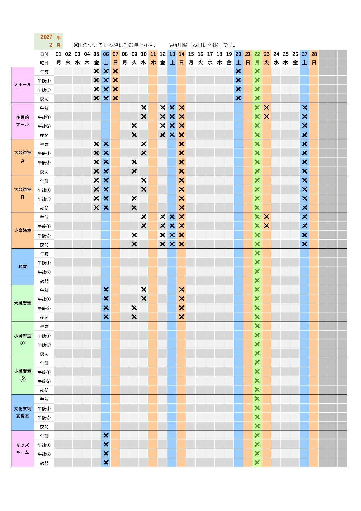 令和9年2月ご利用の抽選申込期間は令和8年1月21日(水)9時00分から令和8年1月30日(金)19時30分までとなります。期間日時外の受付は行いませんのでご注意ください。