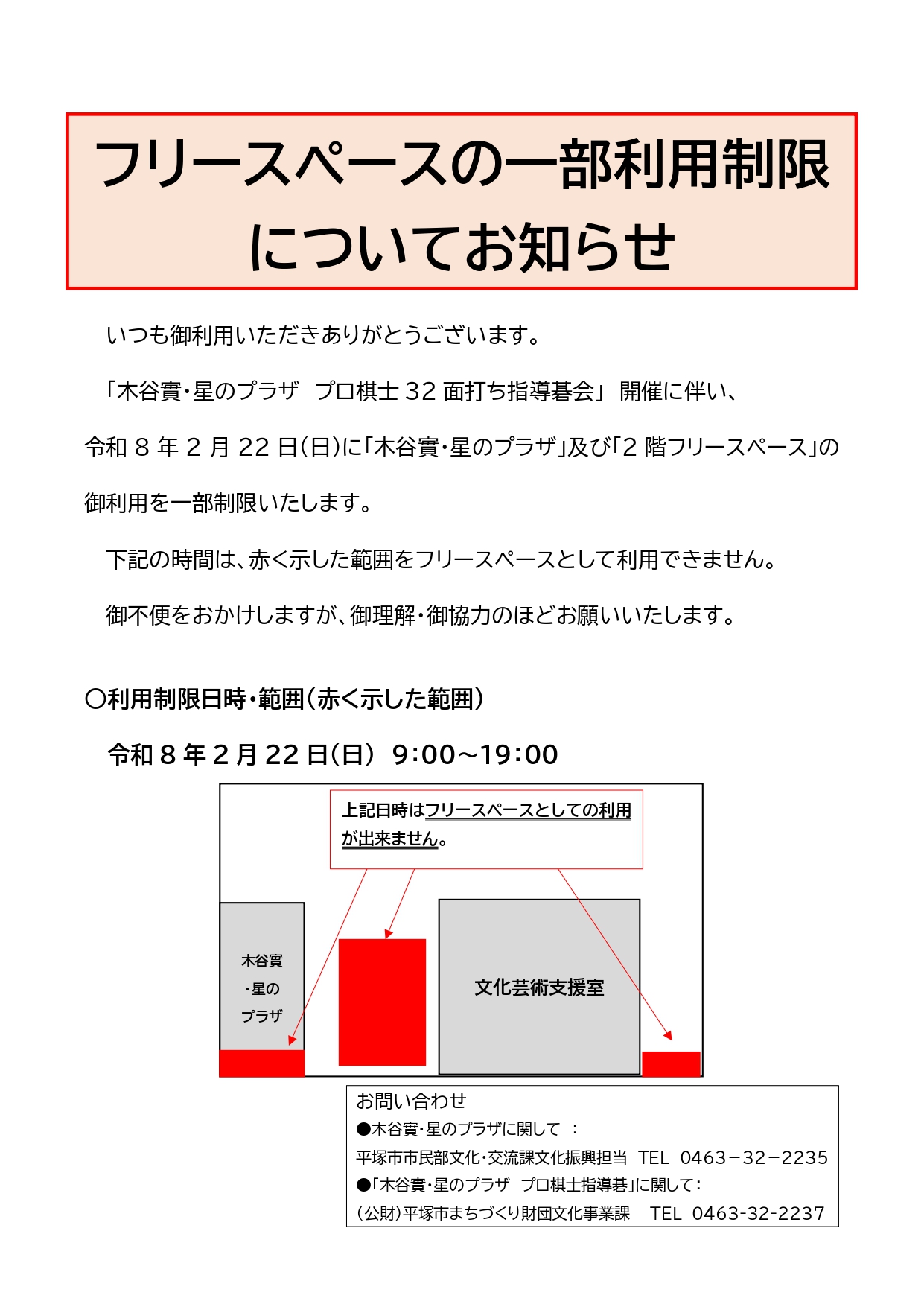 「木谷實・星のプラザ プロ棋士32面打ち指導碁会」開催に伴い、令和8年2月22日(日)9:00から19:00は、「木谷實・星のプラザ」及び「2階フリースペース」の御利用を一部制限いたします。御不便をおかけしますが、御理解・御協力のほどお願いいたします。